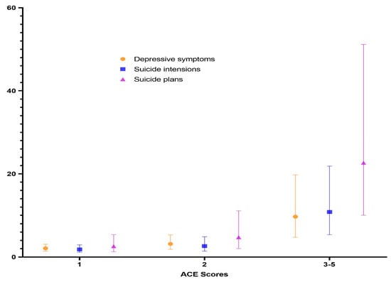 3.4. Associations of ACE Score and Depressive Symptoms, Suicide Intensions, Suicide Plans