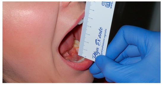 Clinical evaluation of the effectiveness of intra-articular injections was based on the results of maximal interincisal distance, which was estimated in RDC/TMD axis I (Figure 1) [4], and subjective evaluation of the intensity of the mean value of pain experienced in the last week in the temporomandibular joints (Visual Analogue Score (VAS) from 0 to 10) RDC/TMD—Axis II.