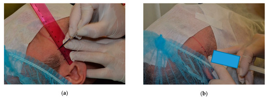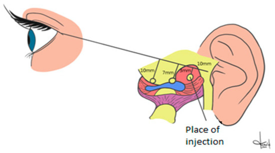 A disinfectant was used to wash the skin and to decontaminate the field of the injection. Injections were made in the determined point with the mandible maximal opened. A line drawn on the skin between the earlobe and the outer eye corner was used for preparing the patients for the procedure. Starting from the earlobe 10 mm intervals were used for marking three segments. The first line had 3 mm, the second 5 mm, and the third had 7 mm. The PRP injection site was selected by the top of the first line (3 mm long). It corresponded with the upper compartment and retrodiscal zone. After injection, the skin was disinfected once again. Patients were given information that experiencing an unpleasant and transient sensation of fullness or compression in the joint regions was possible [15,18]. The same procedure was used with hyaluronic acid. Each of the patient received 0.4 mL of PRP (PRP group) and 0.4 mL of the hyaluronic acid (HA group) for both joints. The procedure was repeated three times, at 10-day intervals [7,9] Figure 3a,b. Throughout the process, all patients were always assigned to the same practitioner.