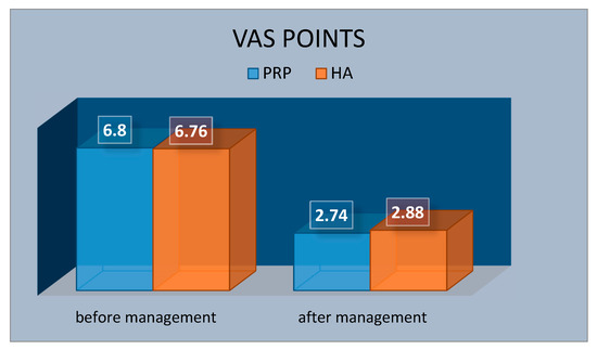 Mean value of Visual Analogue Score (VAS) points—of the temporomandibular joint’s pain before and after management in platelet rich plasma (PRP) and hyaluronic acid (HA) groups.