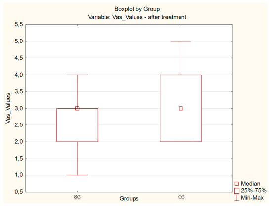 Figure 4, Figure 5 and Figure 6 present the results of pain TMJ assessment using the VAS scale. The difference between mean score values obtained in PRP group (6.80) and HA group (6.76) in the VAS is not statistically significant (p = 0.910), which indicates homogeneity of the groups (Table 2). However, in a post-injection study, the TMJ pain score results indicate a significant reduction in joint’s pain, since, in the PRP group, the mean value of pain intensity was 2.74, and in HA group it was 2.88. These results do not differ statistically significantly between the groups, which means that both administered substances are effective in the repair of intra-articular structures. On the other hand, the results of statistical analysis comparing VAS values before and after management within both groups differ statistically significantly (p-value = 0.00) Table 3.