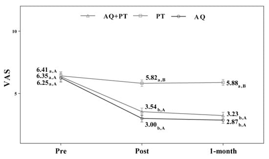 Changes observed in the values of the VAS scale used in the assessment of the participating groups. The bars represent the mean ± SD. AQ + PT group—aquatic therapy and dry land therapy group; PT group—dry land therapy; AQ group—aquatic therapy group; VAS—Visual Analog Scale. a–b—In the same group, different lower-case letters indicate statistically significant differences between time moments (Bonferroni correction). A–B—At the same point in time, different capital letters indicate statistically significant differences between the groups (Bonferroni correction).