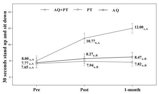 Changes observed in the values of each of 30-s stand-up and sit-down scale used in the assessment of the participating groups. The bars represent the mean ± SD. AQ + PT group—aquatic therapy and dry land therapy group; PT group—dry land therapy; AQ group—aquatic therapy group. a–b—In the same group, different lower-case letters indicate statistically significant differences between time moments (Bonferroni correction). A–B—At the same point in time, different capital letters indicate statistically significant differences between the groups (Bonferroni correction).