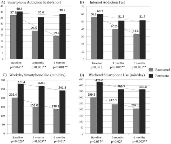 | Smartphone Addiction Scale-Short | 37.1 ± 5.6 | 40.4 ± 6.0 | 0.043 * |