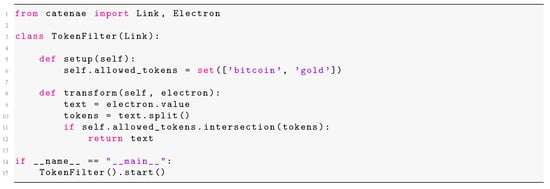 - Middle microservices. These microservices receive data from other modules, make some sort of transformation or filtering, and emit data to other modules. For example, filters or classifiers constantly consume and emit data and can be developed in a very simple way. To further prove this point, Figure 2 shows how to code a simple filter in CATENAE. The Python class works from a set of allowed tokens (e.g., pre-defined keywords) and only those texts that have some of the allowed tokens are passed to the next stage.
