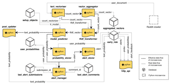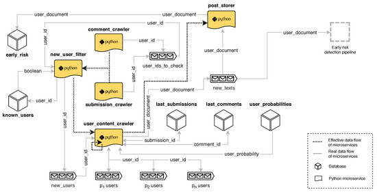 A key goal when monitoring users in SM is to maximise the number of users and contents that can be analysed. To this aim, we need to constantly collect new user submissions (posts or comments) and, thus, we developed a web crawler to extract contents published in Reddit. We followed standard Robot Exclusion Protocol guidelines and respected the constraints imposed by Reddit in its robots.txt file. Our crawler uses CATENAE and incorporates multiple horizontally-scalable microservices. The architecture is shown in Figure 3. The main elements of the crawler are:
