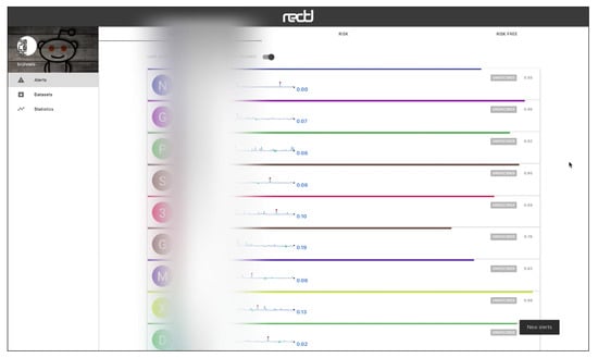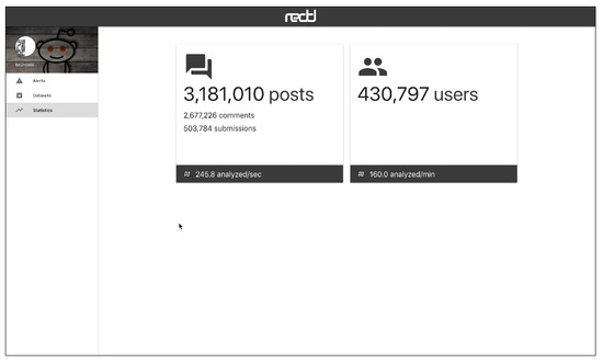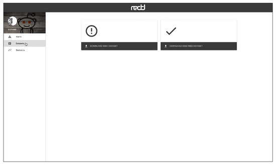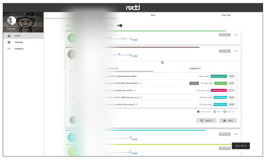 The web interface has three main views, which are connected to a HTTP API. Figure 5 shows the “Alerts” view, where the user can inspect the alerts emitted by the system in real time. The alerts can be ordered by recency or priority (where the users whose probability of depression is higher are shown first). Each alert corresponds to one user and the tools presents the user’s posts and comments. The individual submissions are ordered by decreasing probability and the expert can review the user’s history of submissions. After inspection, the expert can label the alert as a true positive (risk) or false positive (non-risk). In this way, the tool facilitates the construction of new SM datasets and benchmarks. When an alert is fired, the tool also plots a line chart that represents the temporal evolution of the user (see Figure 6). Each point in the plot represents the estimated probability of depression obtained at a given point of time. These probability values are generated at the time points where the user made new submissions (the new post or comment is employed to update the user’s representation and, next, the user classifier produces a new probability estimate). The alerts are organised into three tabs in the view. The default tab contains the untagged alerts, while the tagged alerts are organised into a true positives tab and a false positives tag. The “Datasets” view allows the expert to download the true positives, the false positives or all users (see Figure 7). The “Statistics” view reports basic real-time information about the screening tool (total number of post or comments processed, number of users analysed, and processing speed (see Figure 8)).