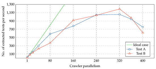 Figure 9 reports the number of extracted texts per second for two crawling experiments performed on Reddit in different days. A single virtual machine was launched and crawler parallelism was tested from 1 to 400. Each configuration was executed during five minutes. Reddit’s workload and response times varied over the experiments and, thus, the two tests show slightly different patterns. With higher response times, the optimal number of instances of the crawler is higher. When the parallelism score was greater than 320, performance starts to degrade for both experiments.
