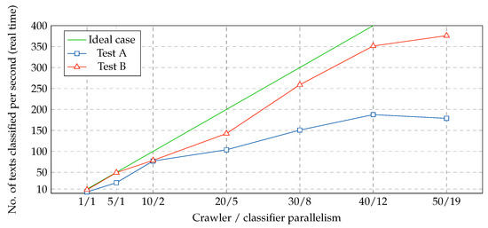Figure 10 reports the results of two experiments run with the classifier and the crawler during different days. To ensure real-time processing of the submissions, crawler parallelism was evaluated from 1 to 50 (with crawler parallelism scores higher than 50, real-time processing was not achieved) and the parallelism of the classifier was directly set based on the crawler’s parallelism score. Each configuration was executed during five minutes. This experiment was repeated for Test B with the same parallelism settings. The results were highly satisfactory (higher efficiency of the crawler compared with Test A, while still maintaining real-time processing).