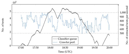 In a final experiment, we configured a three-node cluster using Apache Kafka and ran an experiment for three hours (see Figure 11). There were large fluctuations on crawling capacity (between 500 and 1000 extracted submissions per second). As a consequence, the size of the queue of pending (unclassified) aggregated vectors oscillated substantially. This suggested that a fixed parallelism in both topologies (or even a fixed number of nodes) is not an optimal choice. In order to perform better, the system should scale up and down automatically and avoid wasting resources. In the future, we will work on designing an execution graph controller that automatically adapts the parallelism levels to the current workload.