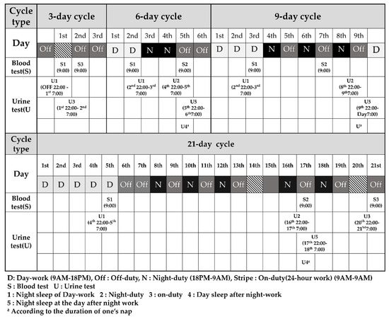 Lastly, in order to measure the hormonal change during the recovery process of individuals’ circadian rhythm after their night duty, their urine was sampled right after their night duty, and these were labeled as uC4. More urine was collected the next day from 10 PM to 7 AM the following morning, and these were labeled as uC5.