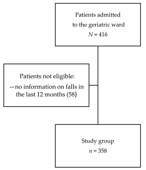 A total of 358 (86.1%) patients of 416 hospitalized during the study period—or their guardians—answered the question about the occurrence of falls in the last 12 months and were included in the analysis (Figure 1). Falls in the previous year were reported by 43.9% of them. The median age of patients was 82 years (IQR 77–86) and most of them were above 75 years of age (83.2%) and female (77.9%).