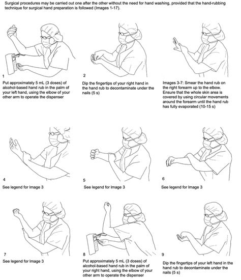 Hand-rubbing technique for surgical hand preparation. From WHO guidelines of hand hygiene in health care [15].