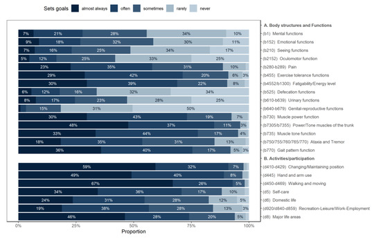 This study focuses on survey items pertaining to goal setting, the functions assessed, and the outcome measures used. Respondents (PTs) were asked to rate, on a five-point Likert scale, whether and how often (never, rarely, sometimes, often, and almost always) each body function and structure, activity and participation level, were goals of their therapy in MS patients. They were also asked about the number of goals they set, and their utilization of the SMART (Specific, Measurable, Achievable, Realistic, Timed) approach [20] to setting and monitoring goals. Questions regarding which domains (on body function, activity, and participation level) were assessed (and how often) were also included in the survey, and these were further detailed by questions on the outcome measures being used. Using the ICF browser, each domain was labelled with its respective ICF code according to body function, activity, and participation level (Table S1).