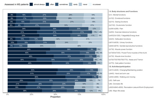- Holper, L.; Coenen, M.; Weise, A.; Stucki, G.; Cieza, A.; Kesselring, J. Characterization of functioning in multiple sclerosis using the ICF. J. Neurol. 2010, 257, 103–113. [Google Scholar] [CrossRef] [PubMed]