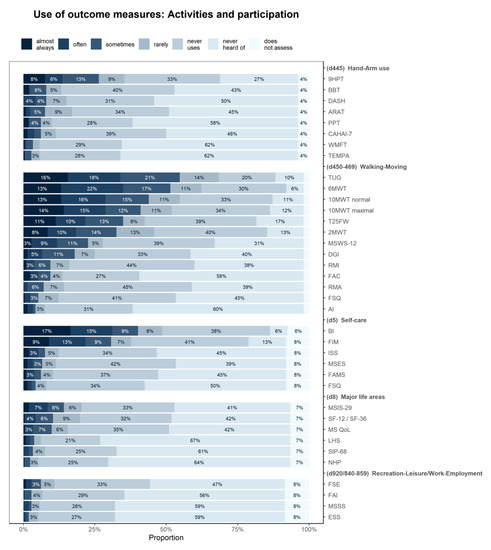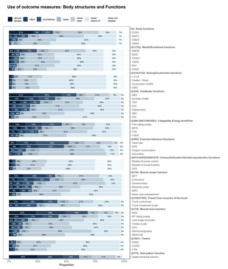 The Modified Ashworth scale for assessment of muscle tone function (used at least “sometimes” by 68% of respondents), spatio-temporal parameters for gait pattern (61%), and the Berg Balance Scale (59%) were the most commonly used outcome measures at body function level. The Timed Up and Go test (55%), the 6-min walking test (52%) and the 10-Meter Walk Test at normal speed (44%) were the most commonly used outcome measures at activity level, all of them in the walking and moving domain.