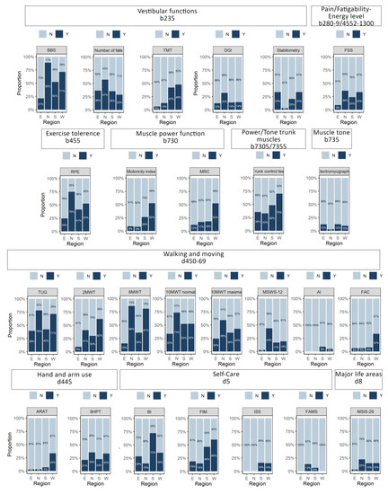 Significant differences between European regions in the use of outcome measures for body structure/function and activity/participation level. BBS: Berg Balance Scale, TMT: Tinetti Mobility Test, DGI: Dynamic Gait Index, FSS: Fatigue Severity Scale, RPE: Borg Rating of Perceived Exertion, MRC: Medical Research Council Scale, TUG: Timed Up and Go, 2MWT: 2-Minute Walking Test, 6MWT: 6-Minute Walking Test, 10MWT normal: 10-Meter Walk Test at normal speed, 10MWT maximal: 10-Meter Walk Test at maximal speed, MSWS-12: 12-Item Multiple Sclerosis Walking Scale, AI: Hauser Ambulation Index, FAC: Functional Ambulation Category, ARAT: Action Research Arm Test, 9HPT: Nine Hole Peg Test, BI: Barthel Index, FIM: Functional Independence Measure, ISS: The Incapacity Status Scale, FAMS: Functional Assessment of Multiple Sclerosis, MSIS29: Multiple Sclerosis Impact Scale. Also see Table S2.