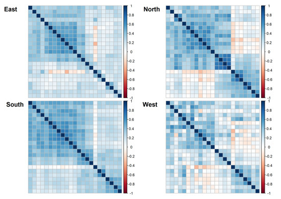 Relationships between individual body functions/activities assessed in four European regions. Ordering of body functions/activities kept the same as in Figure 6.