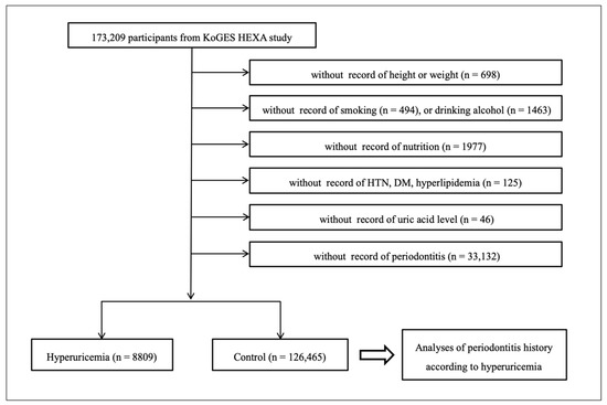 Among 173,209 participants, we excluded the participants who lacked records of height or weight (n = 698), smoking history (n = 494), alcohol drinking habits (n = 1463), nutrition records (n = 1977), hypertension, diabetes mellitus, hyperlipidemia histories (n = 125), uric acid measurement (n = 46), and periodontitis history (n = 33,132). Many participants were excluded due to periodontitis histories because this was not surveyed from 2004 through 2006. Finally, 8809 patients with hyperuricemia and 126,465 patients without hyperuricemia (control participants) were selected (Figure 1). Then the study analyzed the histories of periodontitis between hyperuricemia and control participants.
