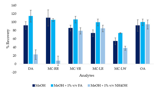 Preliminary pre-concentration tests were undertaken on tap water samples (250 mL) enriched with 800 ng L−1 of each analyte to evaluate the role of different parameters, namely extraction pH and composition of the cartridge eluting phase. Analyte adsorption was calculated as the difference between the quantity loaded and that determined in the percolate, after its evaporation in a vacuum. To this aim, the percolate residue was taken up first with 2 mL of tridistilled water to dissolve any traces of DA, the most hydrophilic compound, and then with 2 mL of MeOH to best dissolve the fractions of MCs and OA eventually not retained on the solid phase. Adsorption resulted as pH independent for all analytes except for DA, which needed acidic conditions to be retained on the cartridge, as just previously reported [25]. Therefore, extraction needed to be carried out at a pH close to 3, which was achieved using FA. The elution step was then studied testing MeOH as the eluent, with good recoveries for most of the analytes, except for MC-LW, which was not quantitatively desorbed (R < 70%), even when the eluent volume was increased from 2.5 mL to 4 mL (data not shown). To improve recovery, methanolic elution solvents with FA (1% v/v) or NH4OH (1% v/v) were then tested. Based on the results shown in Figure 2, MeOH + 1% v/v NH4OH failed to desorb the majority of analytes, so it was excluded as an eluent. Higher recoveries were observed for MC-LW using MeOH + 1% v/v FA as the eluent (R > 75%), in agreement with Zervou et al. [24]. Moreover, the use of MeOH + 1% v/v FA gave an improvement in the chromatographic performance, so it was selected as the eluting solvent (2.5 mL).