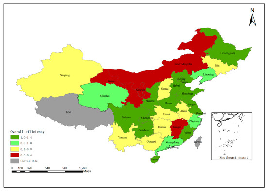 Geographical distribution of the overall agricultural production efficiency (China).