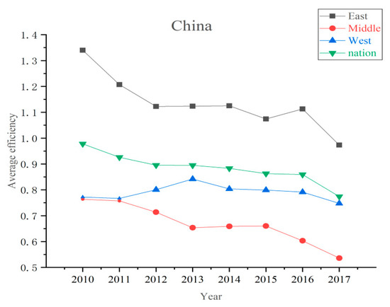 By calculating the efficiency values of the east, middle, west, and the whole nation in 2010–2017, the average efficiency values of each region show a downward trend. In 2010–2012, the national average efficiency dropped the most significantly, from 1.34 to 1.12. The rest of the year also showed a downward trend, falling to 0.97 in 2017. Among them, the average efficiency of the eastern region is the highest, and the middle region is the lowest. In 2015–2016, the efficiency of the eastern region shows a temporary upward trend, but in 2017 it dropped to about 1.
