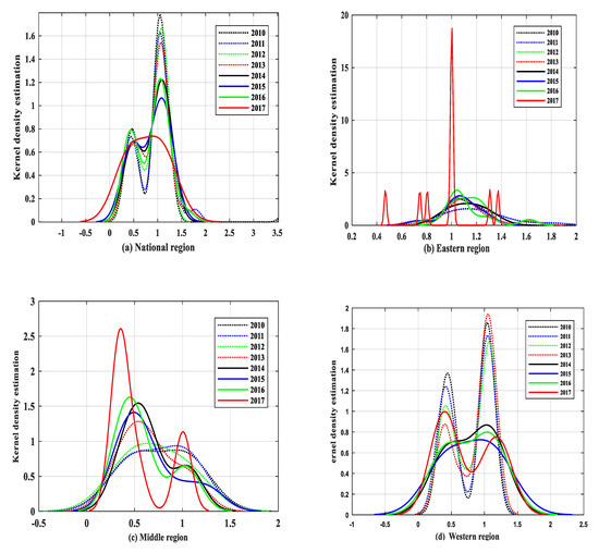 Figure 4 summarizes the distribution of the kernel density curves in the national, east, middle, and western regions.