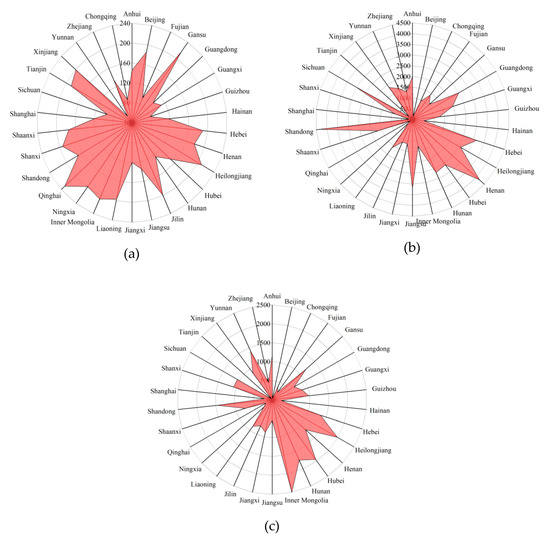 Radar maps of the following variables for each province over 8 years (China). (a) Extreme weather days (EWD); (b) gross output value of agriculture (GOVA); (c) crop disaster area (CDA).