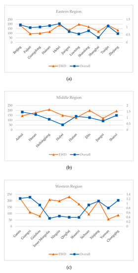 Line charts of EWD and overall agricultural production efficiency (China). (a) East; (b) Middle; (c) West.