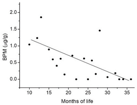 Data were summarized using Microsoft Excel 2013 (Microsoft 365, Microsoft Corporation, USA), mean concentrations were calculated on volume-based and creatinine-adjusted basis for positive samples. Statistical analyses were performed using the R3.4.3 statistical package (R Foundation for Statistical Computing, Vienna, Austria). The influence of age and sex on the results obtained for each BP was analyzed using a generalized linear model (GLM) corrected for the binomial family based on the presence (≥LOQ = 1) and absence (<LOQ = 0) of BPs. The plot of BPM concentration (μg/g) vs. age (in months) of infants and toddlers (Figure 1) was obtained from the average concentrations of BPM per months of life. In the case of infants or toddlers with same months of life and detectable concentrations of BPM, an average concentration between the values was used on the y-axis.