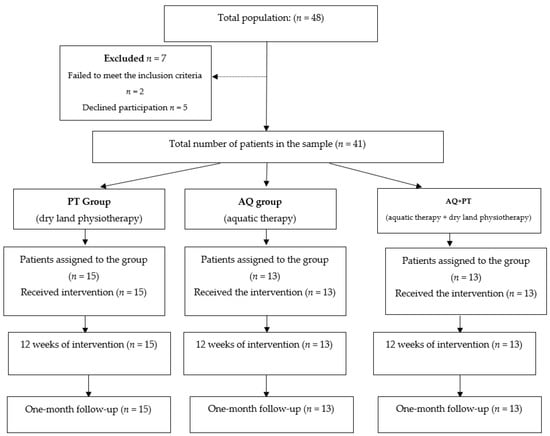 None of the participants experienced any significant treatment-related adverse events, and all patients in the intervention groups were fully compliant with the intervention program. There were no dropouts. All the sessions performed in the water were taught by an external physiotherapist, over a 12-week period. The sessions lasted 45 min and were conducted twice weekly. The participants performed the exercise in a therapeutic pool 20 m long × 6 m wide, with a water depth of 1.4 m. The water temperature was 34 to 36 °C with an air temperature of 24 °C. Another physiotherapist led the dry land therapy with the same number of sessions and durations.