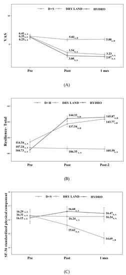 Concerning the values obtained in the resilience scale, in the experimental group and aquatic therapy, significant differences were observed compared to the results obtained in the control group (dry land therapy), and these improvements were maintained one month after completing the treatment program.