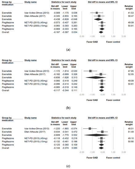 The patients receiving exenatide had significantly larger improvements in MDRS scores than those in the control group (−0.595, 95% CI, −1.038 to −0.151, p = 0.009). Heterogeneity was not statistically significant (p = 0.264 and I2 = 19.8%). No significant differences were observed between the pioglitazone and control treatments (−0.144, 95% CI, −0.379 to 0.090, p = 0.227; Figure 3a).