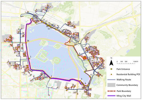 Baidu Map (http://map.baidu.com) is a popular online map in China, which has been used to search for geographic data (such as POIs and travel routes) in recent studies [35]. We first acquired 664 residential building points of interest (POIs) and 100 community boundaries (scraped in August 2019) of surrounding areas of Xuanwu Lake Park from Baidu Map [34]. According to the policy of the 15-Minute Community-Life Circle, a 15-min walk to parks is important for residents in China, which corresponds to about a 1000-m distance. Coding with Python 3.7, we called the travel navigation function of Baidu Map to scrape 1554 recommended walking routes from residential buildings to the entrances of Xuanwu Lake Park, with a 15-min duration as the threshold (processed in August 2019). The recommending routes were taken as the shortest routes, according to the Application Programming Interface (API) of Baidu Map, which also included the information of route distance, duration, starting, and ending points [36]. Beside park entrances, residential buildings, and the walking routes connecting them (Figure 1), the data obtained in this study also included (1) population density data of Nanjing (100 100 m precision raster data in 2018), (2) street view photo data (15,528 photos, scraped in October 2019, from Baidu Map), and (3) all types of POIs around Xuanwu Lake Park (scraped in August 2019, including restaurants, hotels, markets, public facilities, scenic spots, recreation facilities, gyms, schools, cultural-related facilities, medical facilities, automobile services, traffic facilities, banks, residential areas, companies, and administrative machineries [37]).