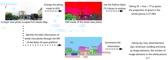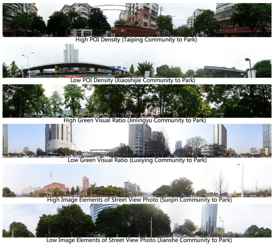 Taking the community boundary as the analysis unit, we selected the shortest route among residential building POIs in each community to analyze the pedestrian environment from communities to the park. The pedestrian environment of route analysis covered the criteria of route distance, PRD, the number of turns, the number of crossings, POI density along the route, green visual ratio, and image elements of street view photo, as shown in Figure 7.