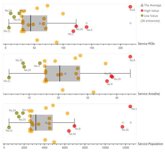 The service POIs, area, and population across different entrances varied significantly, due to the extensive interface of Xuanwu Lake Park with various parts of the city (Figure 4). Entrances No. 8, No. 9, No. 26, and No. 1, which are located to the west and north of Xuanwu Lake Park, served more POIs: 217, 141, 123, and 118 POIs, respectively. Entrances No. 25, No. 24, and No. 22, located to the north of the park, served fewer POIs: 24, 15, and 9 POIs, respectively. Entrance No. 11 served the least POIs, just 6. The service area and service population shared similar trends. The average service POIs, area, and population per entrance were 60, 22.37 ha, and 4145, respectively.