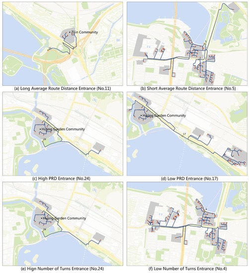 Cases of indices of entrances: (a) long average route distance entrance; (b) short average route distance entrance; (c) high PRD entrance; (d) low PRD entrance; (e) high number of turns entrance; and (f) low number of turns entrance (Base map from Tianditu Map).