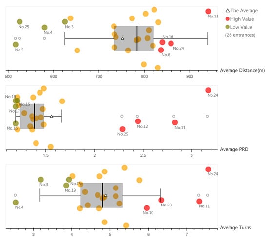 PRD: The average PRD from residential buildings to entrances was 1.56 (Figure 6). The PRDs of entrances No. 24 and No. 11 were as high as 3.17 and 2.83, respectively. The high PRD of entrance No. 24 can be attributed to the south gate of Hujing Garden Community being closed, which led to more roundabout routes (Figure 5c). The PRD of entrance No.11 was high mainly due to the tortuous road linking the entrance. The PRD of entrance No. 12 was high also (2.45), which can mainly be attributed to its proximity to the highway, resulting in a long walk for residents to travel across. The PRDs of Nos. 16–21 were as low as 1.20, indicating the more permeable street network near these entrances (Figure 5d).
