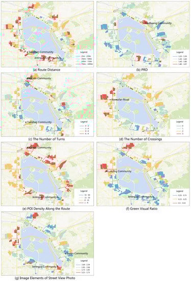Pedestrian environment analysis of the routes from communities to the park: (a) route distance; (b) PRD; (c) the number of turns; (d) the number of crossings; (e) POI density along the route; (f) green visual ratio; and (g) image elements of street view photo (base map from Tianditu Map).