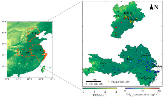 In this paper, the study areas were BTH, YRD, and Hubei province. Hubei province is the area worst hit by COVID-19. We collected PM2.5 data of the study area in three periods listed in Table 1 from the China National Environmental Monitoring Center (http://106.37.208.233:20035/) and Beijing Municipal Environmental Monitoring Center (http://www.bjmemc.com.cn/). The stations owning over 20% missing values during the months of the study periods were omitted. In total, 359 out of 422 stations were retained and the missing data percentage of the remaining stations was 3.49%. The remaining missing observations were interpolated via linear interpolation based on the PM2.5 observations of the previous and later hours if both of them existed. Otherwise, interpolation was conducted via the inverse distance squared method according to the observations of other stations. The accuracy of the interpolation procedure was validated via 10-fold cross validation and the average mean absolute error was 4.78 . Figure 1 shows the study area’s locations and spatial distribution of mean PM2.5 concentration during SD. From Figure 1, PM2.5 showed a worsening pollution trend from south to north, except for Northern Hebei.
