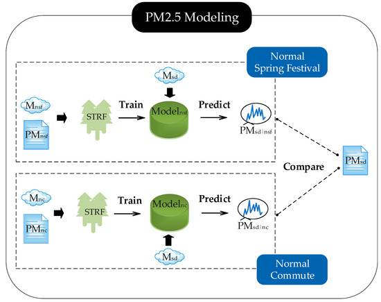 To achieve this goal, this paper established a PM2.5 modeling framework to compare the PM2.5 concentrations under different emission scenarios. The workflow of PM2.5 modeling is illustrated in Figure 2. , , and represent the meteorological data of SD, NC, and NSF periods, respectively, and , , and represent the PM2.5 observations of the corresponding period. The “STRF” model refers to the developed spatiotemporal random forest model in this paper, which will be explained in detail later.