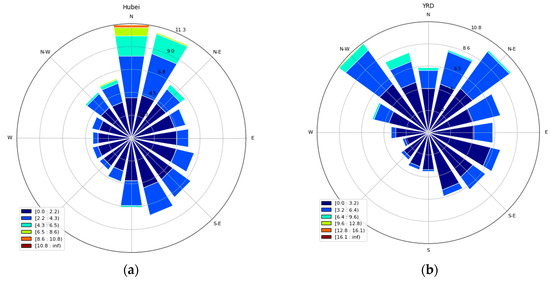 Distribution of wind speed and wind direction of (a) Hubei and (b) YRD during the SD period.
