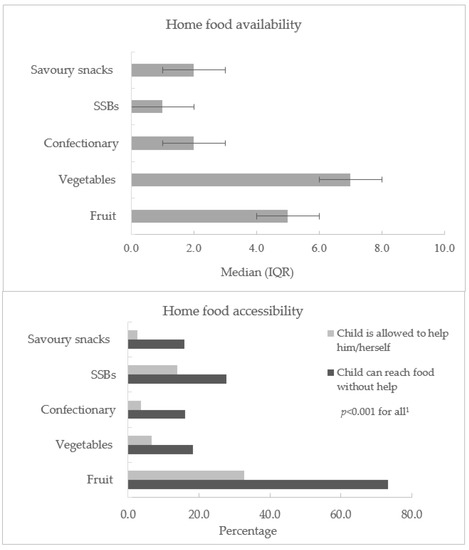 Home food availability and accessibility are among the determinants that are most consistently associated with dietary intake in children and adolescents [82,83,84]. In the present study, the adjusted model showed that the availability of fruits, vegetables and SSBs in the home were associated with higher children’s fruit and confectionary/SSB intakes. Such findings are consistent with a cross-sectional study which examined the home food environment and quality of diet in parent–child dyads in which greater availability of healthful foods was associated with a higher diet quality score [85]. Another international study with pre-schoolers reported that having foods high in sugar in the home was associated with unhealthy dietary patterns, even when fruit and vegetables were also available [82]. A literature review and meta-analysis supported the view that the availability of food items was consistently associated with healthy or unhealthy food consumption in children [83]. The authors hypothesized that it is possible that food availability might increase consumption by children since they tend to eat whatever is available to them [83].