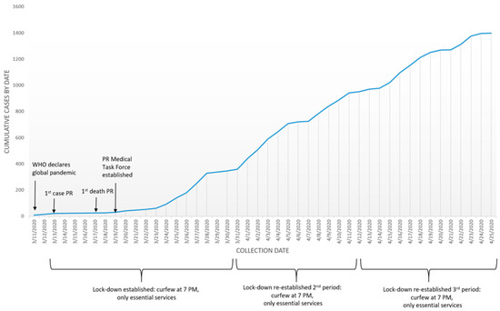 The first case of coronavirus disease 2019 (COVID-19) was reported in Puerto Rico on 13 March 2020, and two days later, a shelter-in-place order for Puerto Rico was established at a time when the World Health Organization (WHO) transmission pattern in Puerto Rico was still classified as sporadic cases (countries/territories/areas with one or more cases, imported or locally detected) [4]. On 19 March 2020, the Governor of Puerto Rico, Hon. Wanda Vázquez-Garced, appointed the Puerto Rico Medical Task Force (MTF) COVID-19 in order to assist the Puerto Rico Department of Health in establishing an early, effective public health response to this epidemic.