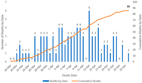 After two weeks of establishing the epidemic response in Puerto Rico, the daily growth curve of positive results in COVID-19 testing decreased from 27.1% to 11.5%. There was also a decrease in the number of deaths after 15 April 2020 (Figure 3).
