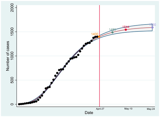 where μi is the cumulative number of confirmed cases, β1 is the predicted maximum number of confirmed cases, β2 and β3 are fitting coefficients, and t is the number of days since the first case [7,8,9]. The nonlinear least-squares estimation command with the Gompertz function in Stata version 16 (StataCorp LLC, College Station, Texas, USA, 2019) was used to predict the number of cases.