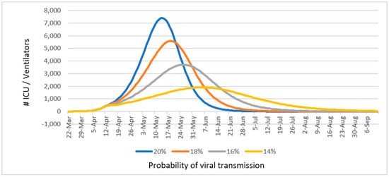 Projected intensive care unit (ICU) and mechanical ventilator needs based on different probabilities of viral transmission (14%, 16%, 18%, and 20%).