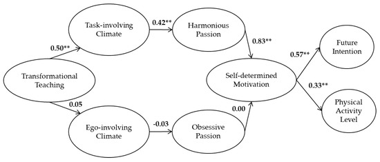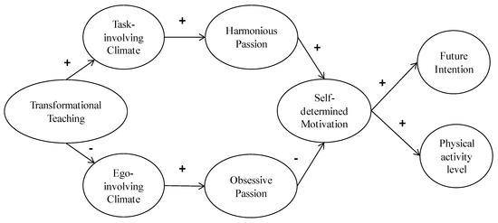 Grounded in a transformational teaching framework, as a conceptual extension of transformational leadership theory [29], AGT [32], and SDT [46], this study examined how PE teachers’ transformational leadership style can predict students’ PA participation. To this end, we examined the associations between PE students’ perceptions of teachers’ transformational teaching style and two PA outcomes (i.e., PA participation in their leisure time and intention to engage in PA in the future), testing the mediational role of motivational learning climates (i.e., task- and ego-involving climate), types of passion (i.e., harmonious and obsessive), and self-determined motivation in this relationship. Overall, the results of this study provided partial support for the hypothesized model confirming most of the proposed relationships in terms of regression paths involving a task-involving climate, harmonious passion, and self-determined motivation. By contrast, the regression paths from transformational teaching to an ego-involving learning climate, from an ego-involving climate to obsessive passion, and from obsessive passion to self-determined (or autonomous) motivation for learning were not confirmed.