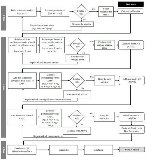 Traditionally, building statistical models starts with selecting variables that can result in a parsimonious model (i.e., having as few variables as possible), explain the data, are stable, and can be generalized to unseen situations []. To develop such models, this study adopted the purposeful selection of variables procedure proposed by Hosmer et al. []. One main advantage of this approach is that it considers both the significance and change-in-estimate criteria when selecting final variables []. Each step will be explained here. One should note that to maintain the language of statistical modeling, accident factors are called “covariates” in this section.