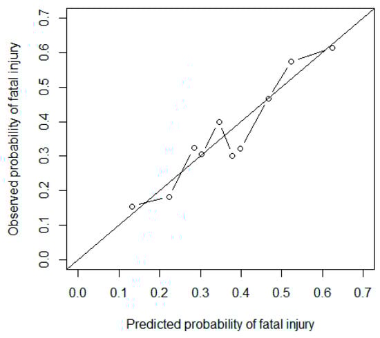 After building models and comparing deviances to determine covariates and build a parsimonious model, one needs to examine how well the data fits the final model. Lack of fit means that estimated coefficients are biased, odds ratios could be misleading, and future predictions are not accurate. To check fit, one can compare predicted values derived from the model to observed values to confirm that the fitted model is correct []. The Hosmer-Lemeshow (HL) statistic is a popular test for goodness-of-fit and has been used in several clinical studies [,,]. The idea is to partition observations based on their estimated probabilities into g (usually 10 to represent deciles of risk) groups featuring approximately the same quantity of observations; here, the first group would represent the lowest probabilities of fatality, the next group would have larger estimated probabilities and so on, until the last group which includes the highest probabilities [,]. The HL statistic is then calculated by comparing the sum of probabilities to the number of observed values in each group. A chi-square test on this value with g-2 degrees of freedom can determine whether there is enough evidence to reject the hypothesis that data fits the model. The ‘hoslem.test()’ function from ‘ResourceSelection’ package in R [] provides the test statistic and p-value of the HL test.